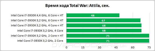 На глобальной стратегической карте частота кадров не столь важна. Тут ключевую роль для комфорта играет время, которое тратится на расчет хода всеми фракциями. После того, как вы выполнили все свои действия, компьютер производит расчет действий для всех многочисленных фракций. И чем дольше вы играете, тем сложнее общая военная-политическая ситуация на карте и больше времени тратится на просчитывание хода виртуальных соперников. Естественно, что тут ключевую роль играет производительность процессора. А насколько процессорозависим данный процесс, и как влияют на него дополнительные ядра, мы выясним по итогам небольшого эксперимента с Intel Core i7-3930K. Зафиксируем частоту процессора на уровне 3,2 ГГц без Turbo Boost и будем постепенно активировать разное количество ядер, играя попутно с Hyper Treading. Заодно проведем тестирование в разгоне. Измеряется время, затраченное компьютером на просчет действий фракций после 70 хода игрока в большой кампании.