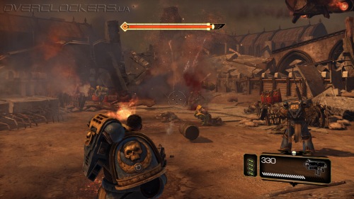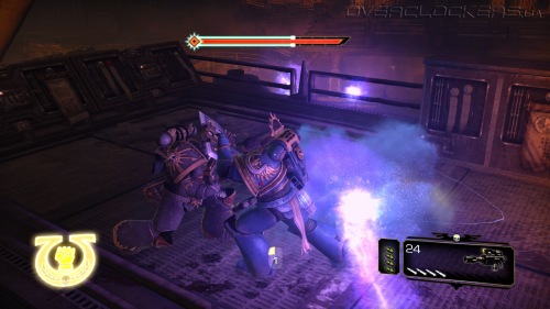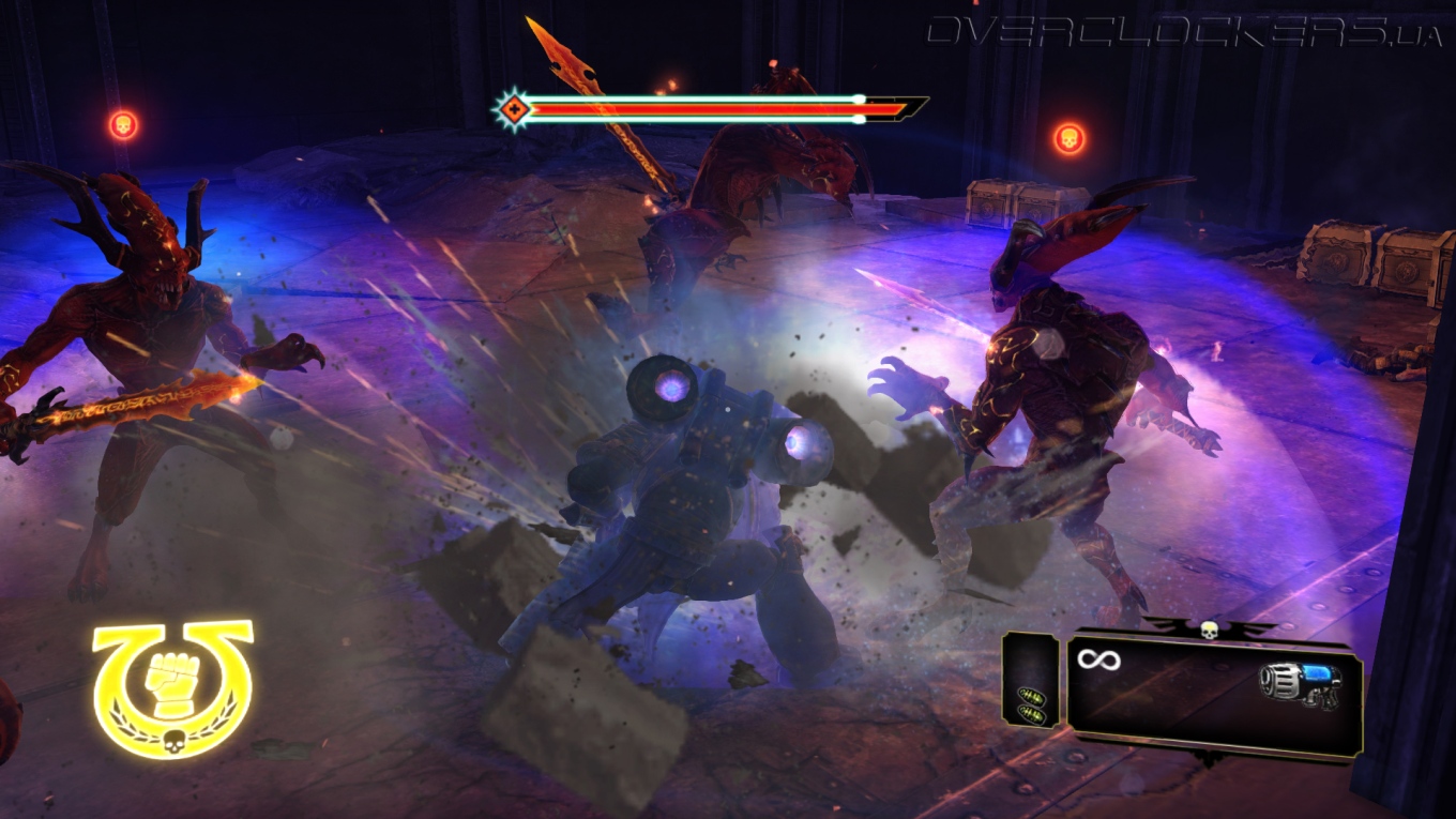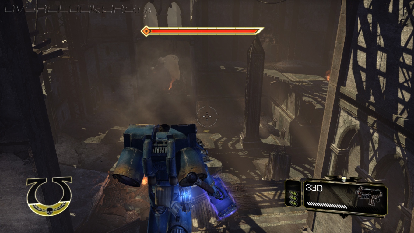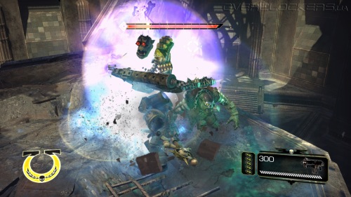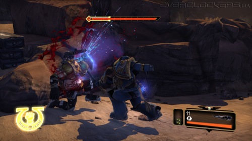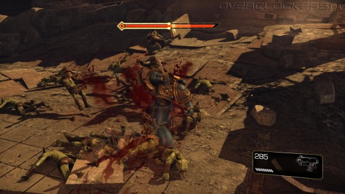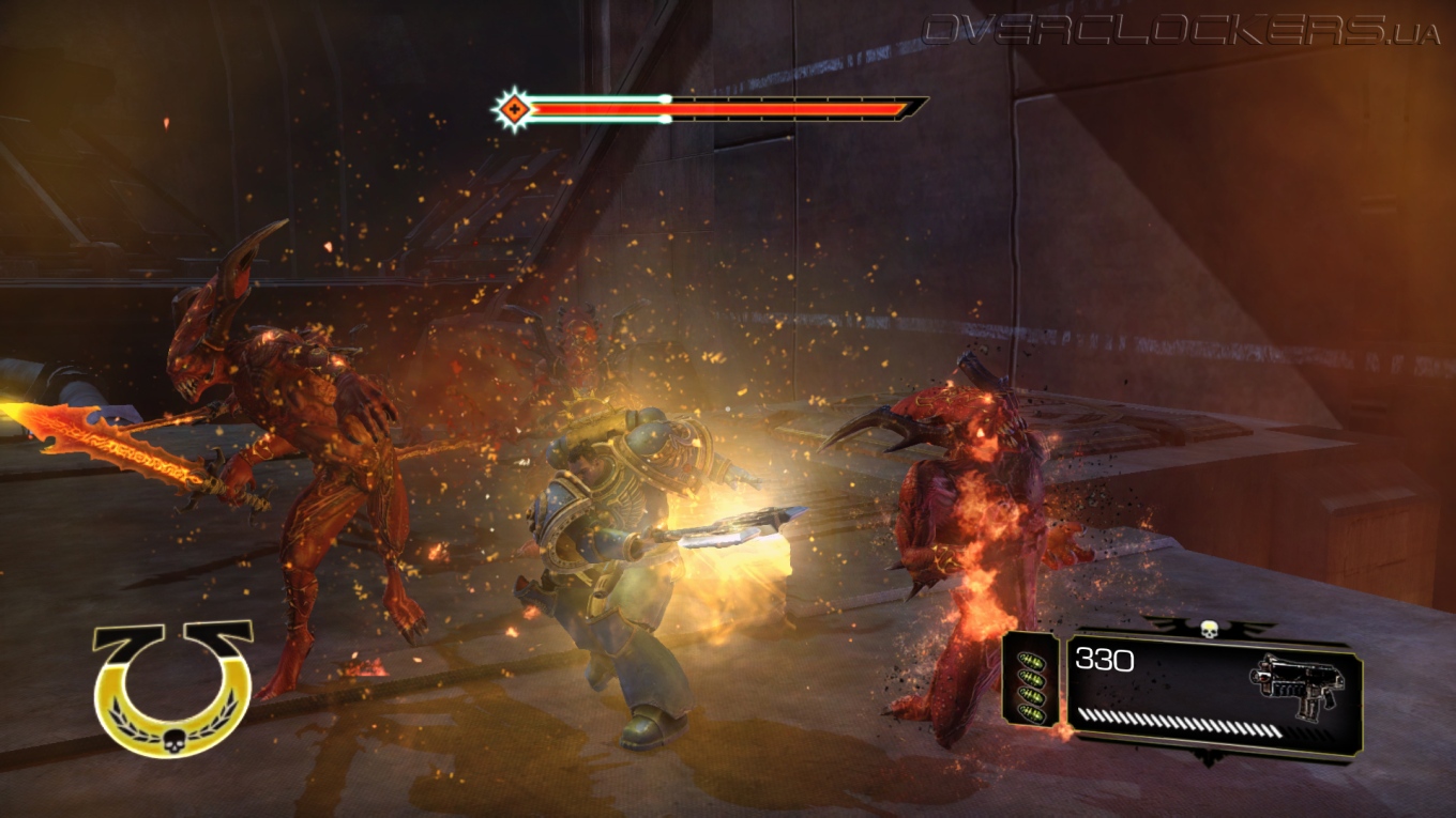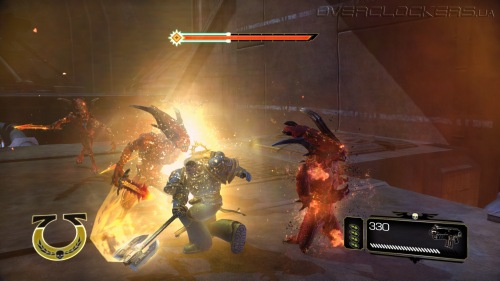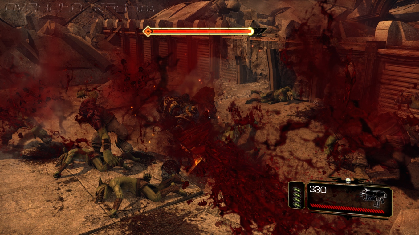 Игровой процесс построен незамысловато. Максимально простое управление, небольшой спектр возможностей и ударов плюс толпы и толпы врагов. На первых порах драки проходят довольно легко, но зрелищно. Проводя простые серии ударов мечом, крушим ближних, дальних расстреливаем из пистолета или автомата-болтера. Никаких укрытий и замысловатых комбо-ударов, даже блока нет. Залог успеха — бить первым и не останавливаться ни на миг. В игре нет аптечек и здоровье восстанавливается не просто так, а за счет пролитой в ближнем бою крови врагов. То есть, чтобы восстановить жизненные силы надо оголтело бросаться в самую гущу битвы, кромсая всех и вся. И это один из столпов геймплея, на котором все и держится. Нас максимально стимулируют к наиболее активным действиям, ведь только это позволяет выжить.