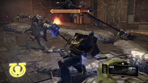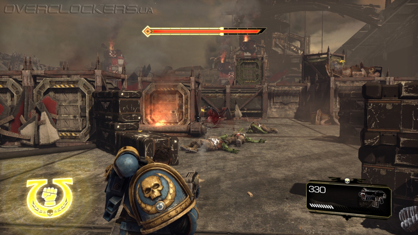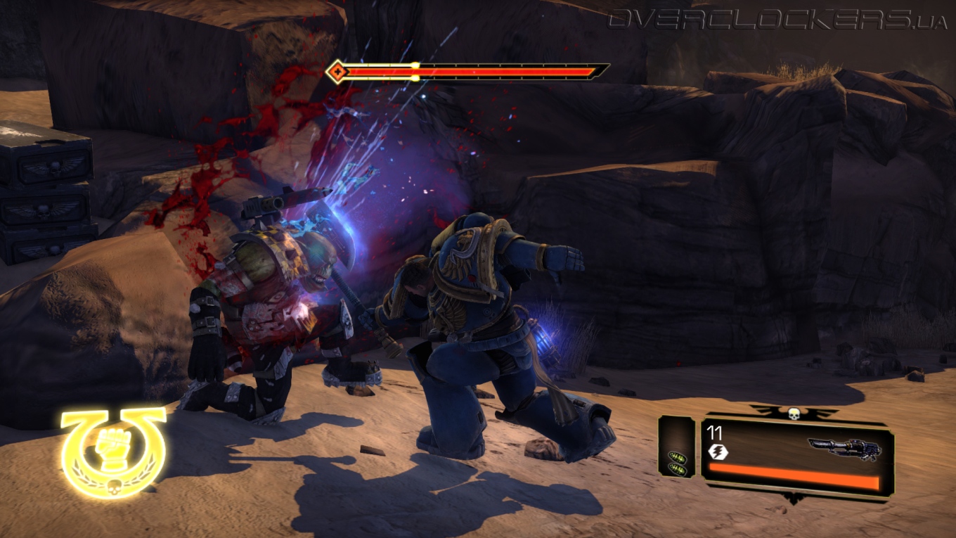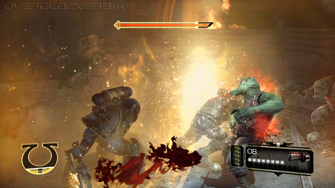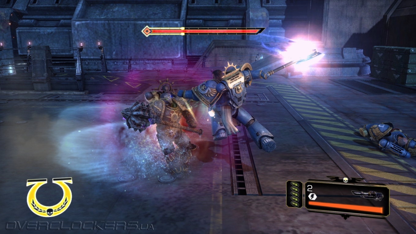 Максимум восполнения здоровья дает добивающий удар оглушенного врага. Для каждого оружия он свой. Если это цепной меч, то на него мы насаживаем орков как мясо на вертел, топор вонзаем в грудь или головы, молотом впечатываем поверженных в землю. Выглядит брутально и зрелищно. Хотя расчлененки, как для такой вроде бы суровой игры, все же маловато. Для проведения таких приемов нужно предварительно оглушить врага, и тут есть нюансы. Если простого орка можно оглушить простым рывком, сбивающим с ног, то на орка- здоровяка или космодесантника Хаоса этот прием никак не подействует. Более мощный топор дает больше шансов провести оглушение в бою, но с сильными врагами предстоит еще выиграть в простенькой QTE-игру. Самое сильное оружие — громовой молот, который позволяет крушить любых здоровяков без QTE. Но с ним мы становимся более медлительными и неповоротливыми. Даже после пробежки останавливаемся не сразу, что дезорганизует в бою. В ближнем бою молот позволяет быстрее уложить всех, да и жизнь с ним набегает быстрее. Но если вы попали под перекрестный огонь, то станете с ним легкой мишенью.
