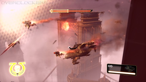 Максимум удовольствия от игры получаешь с ракетным ранцем. Тут то можно уже оторваться по полной. Взмыть и обрушиться сверху, сотрясая землю мощным ударом. От такого не устоит никто. Зеленая мелочь разлетается пачками, враги посерьезнее моментально оглушаются — только и лови момент, да расплющивай их головы своим молотом. При этом и уровни сразу становятся свободнее да просторнее — есть, где развернуться. Сразу чувствуешь себя ангелом смерти и небесным карателем. Вот только все это удовольствие длится недолго. Дав нам побеситься какое-то время, игра вдруг выдает «закончилось топливо» и отправляет в привычный пеший рейд.