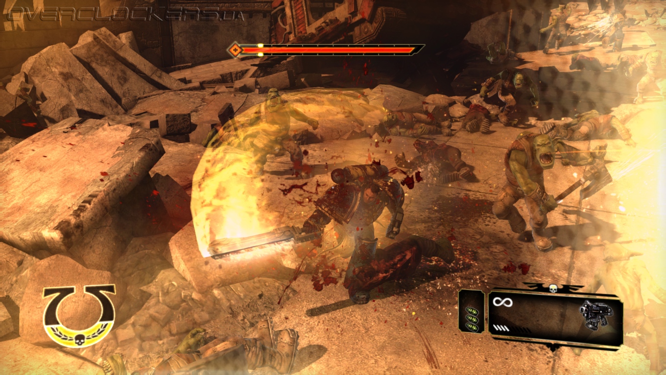 Именно в роли Тита мы и будем проводить зачистку. С первых же минут игра показывает свою сущность — толпы врагов, море кровищи и трупов. Могучий генетически модицифицированный морпех в броне — прирожденная машина смерти. Мы крушим орков пачками налево и направо, освобождаем территории и помогаем уцелевшим подразделениям Имперской гвардии. Попутно встречаемся с инквизитором, который на этой планете проводил таинственные эксперименты и готовил тут победоносное оружие массового поражения. Да вот на беду источник энергии у такого оружия был связан с Варпом. А там где Варп, там и Хаос. Начавшись на радужной ноте орочьего истребления, игра в итоге сводит нас лицом к лицу с опасными демоническим порождениями темной вселенной. На носу новое вторжение армии Хаоса, остановить которое можем только мы.