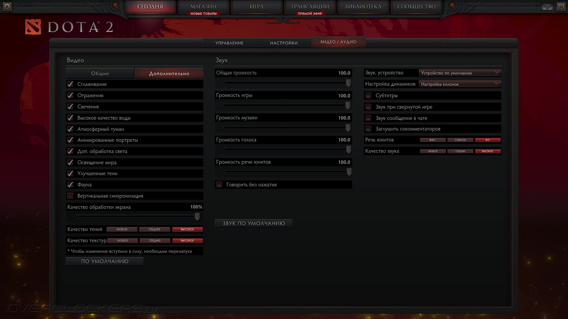 Для всех доступных настроек графики заданы высокие значения. Дополнительно в консоли прописывалась команда fps_max 0, чтобы снять встроенное ограничение fps. Тестовая сцена охватывает начало игры: разбежку по карте, стартовый контроль рун, драку на центральной линии.