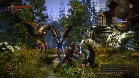 Вместо кликанья мышкой по целям мы теперь непосредственно управляем всеми движениями героя. Бой строится на умелом использовании перекатов и блоков, после которых мы наносим контрудары и добиваем врага. При большом количестве противников работает автонаведение на цель, и Геральт сам выбирает, по кому наносить первый удар. Иногда это работает не совсем так, как нужно, но в целом выбор зависит от положения камеры и, сфокусировав ее на другом противнике, вы тем самым измените цель. Движения по-прежнему филигранны и виртуозны. Наблюдать за тем, как герой фехтует, делает выпады и прыжки — одно удовольствие. Но и первая часть по части движений в бою уделывала любой экшен, ведь разработчики копировали движения с реальных мастеров фехтования с помощью технологии motion capture.