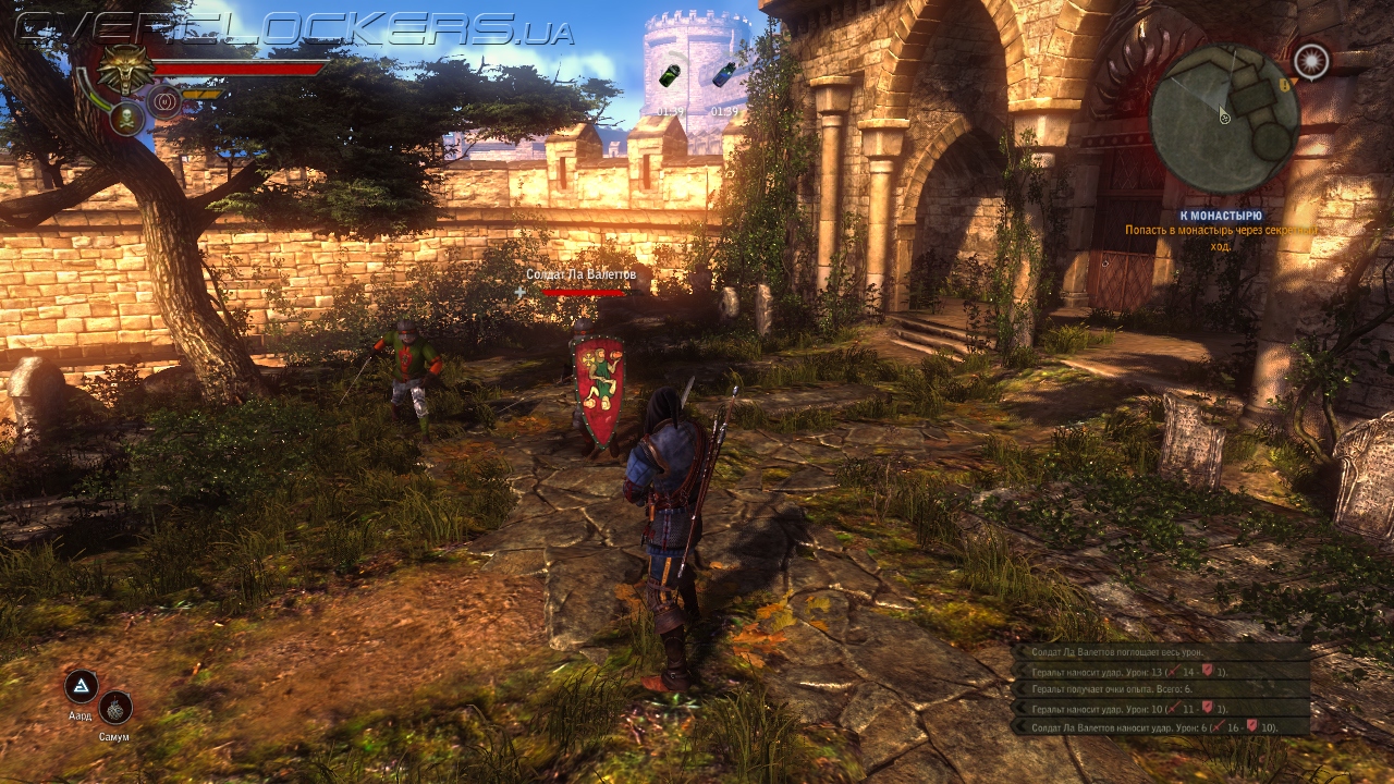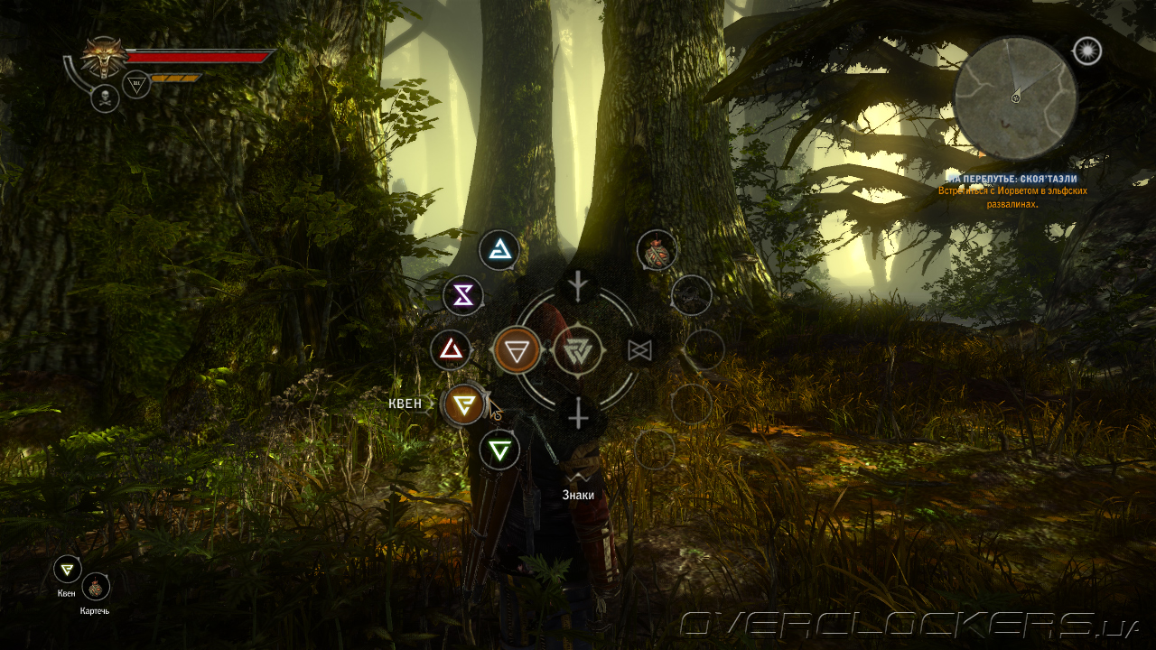 Удачная комбинация знаков служит залогом успешного и быстрого боя. В нужный момент кого-то можно поразить файерболом, отбросить телекинезом или поймать в магическую ловушку сильного врага, чтобы подобраться к нему со спины и нанести более эффективный удар. Можно временно превратить врага в союзника, и он будет драться со своими бывшими товарищами. Можно метнуть в толпу гранату с газом, а подом поджечь его. Очень эффективен знак Квен, который создает вокруг героя защитное поле. После прокачки оно не только гасит урон, но и отражает его на врагов — незаменимая вещь в схватке с бронированными рыцарями и боссами.