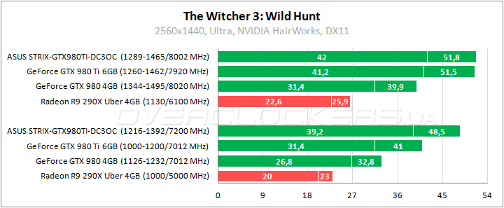 В качестве примера рассмотрим результаты тестов в «Дикой охоте» из последних наших обзоров топовых видеокарт. Вначале взглянем на результаты тестирования в максимальном качестве изображения при полном отключении HairWorks в разрешении 2K.