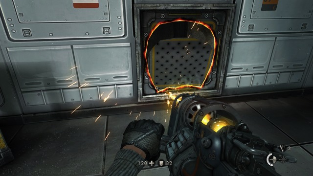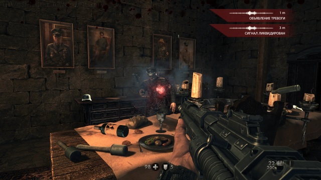 Плавно перетекая к тематике боя, нужно отметить, что впервые в Wolfenstein есть небольшая свобода действий. На некоторых игровых этапах нам позволяют играть в прятки и использовать методы тихого устранения врагов вместо открытых перестрелок. Даже в отсутствие прямой мотивации на скрытное прохождение у игрока есть возможность попытаться хотя бы нескольких болванчиков снять со спины. При этом локации не прямолинейны, всегда есть несколько коридоров, вентиляционные шахты и прочие лазы, которые позволяют разыграть чистый стелс, пробираясь мимо особо сложных врагов и вырезая втихую офицеров. Нейтрализация последних, кстати, играет весьма важную роль. Офицеры могут вызвать подмогу. И если надолго отвлечься на остальных участников вражеского отряда, рискуете быстро получить порцию новых противников.