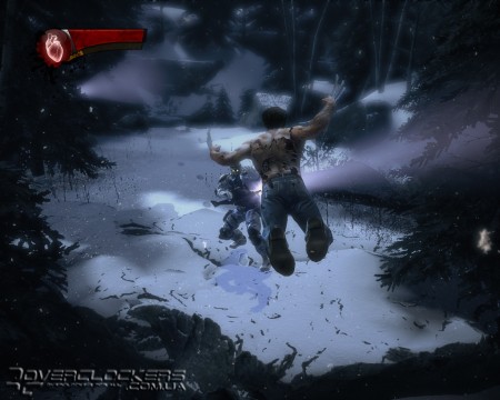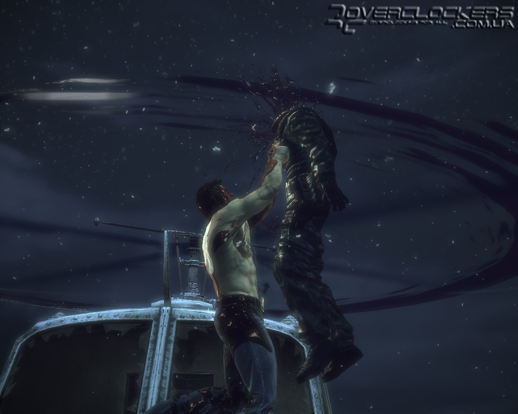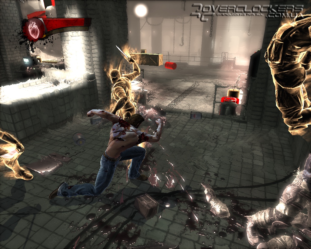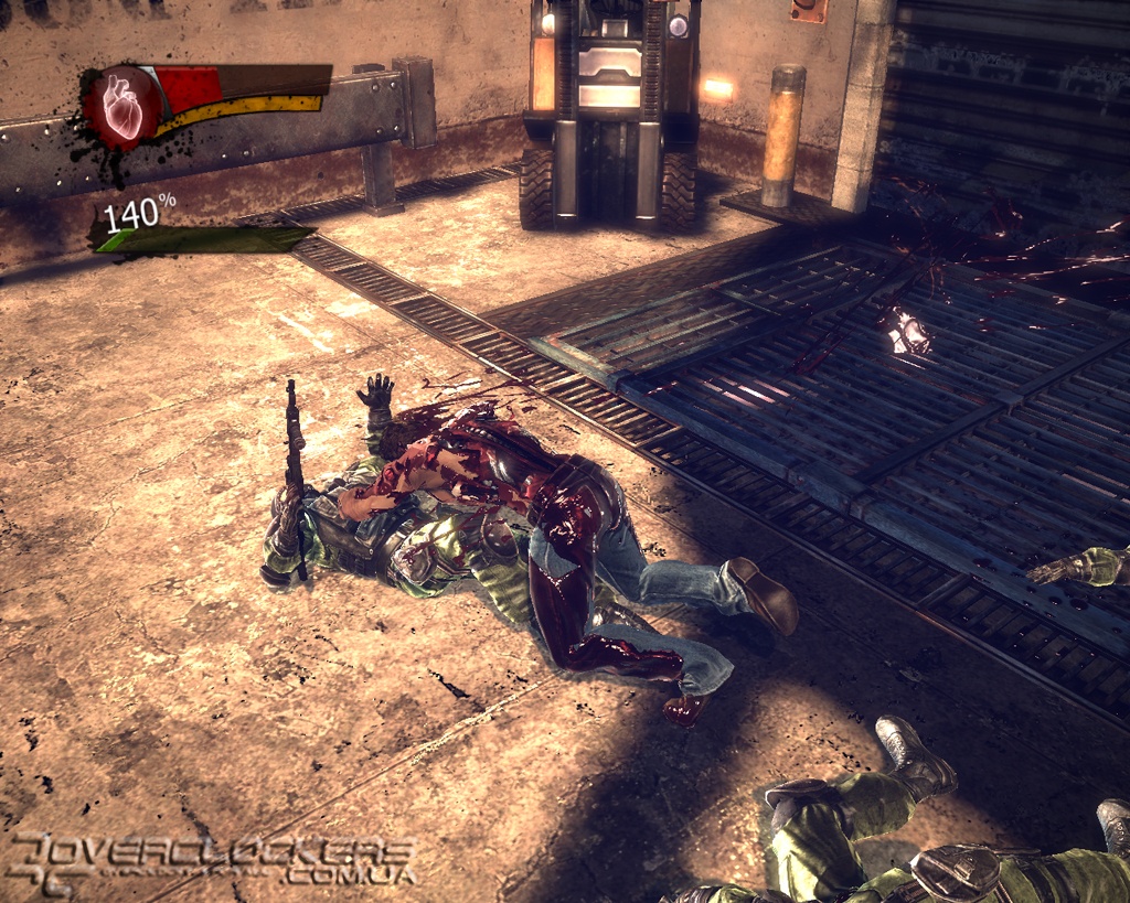 Тело героя отлично реагирует на повреждения и опадания пуль — в нем остаются дырки, царапины, а то и вовсе обнажаются кости. Потом это все начинает заживать прямо на наших глазах (часто вместе с майкой :). И этот визуальный прием наверное самый сильный в оформлении игры, ведь придает ей еще больше брутальности и капельку реализма (если о нем конечно вообще уместно тут говорить).