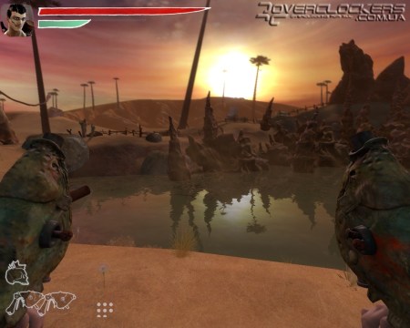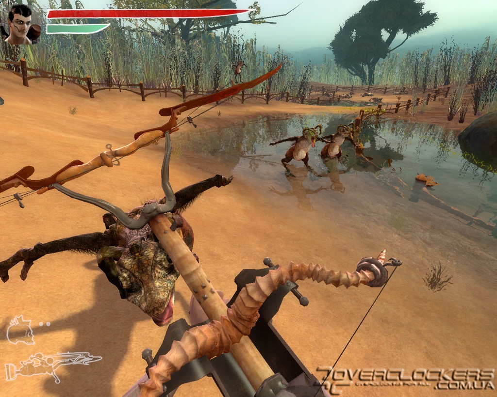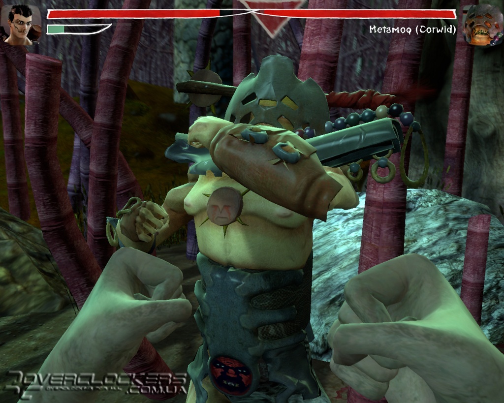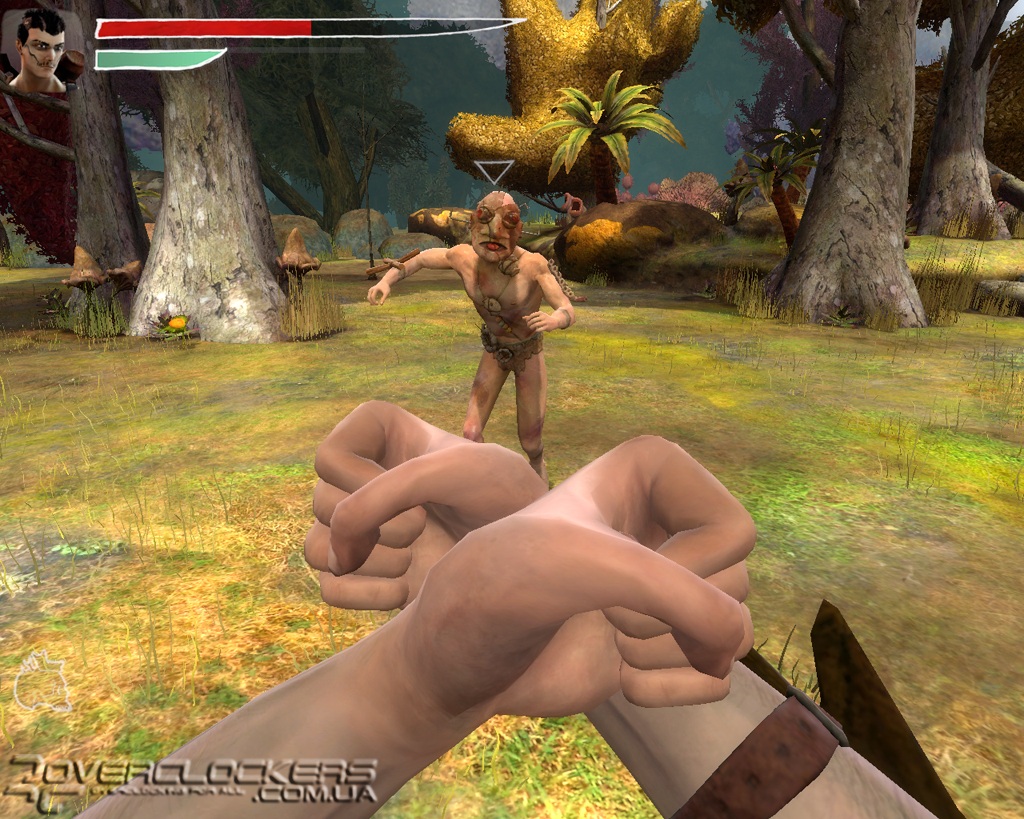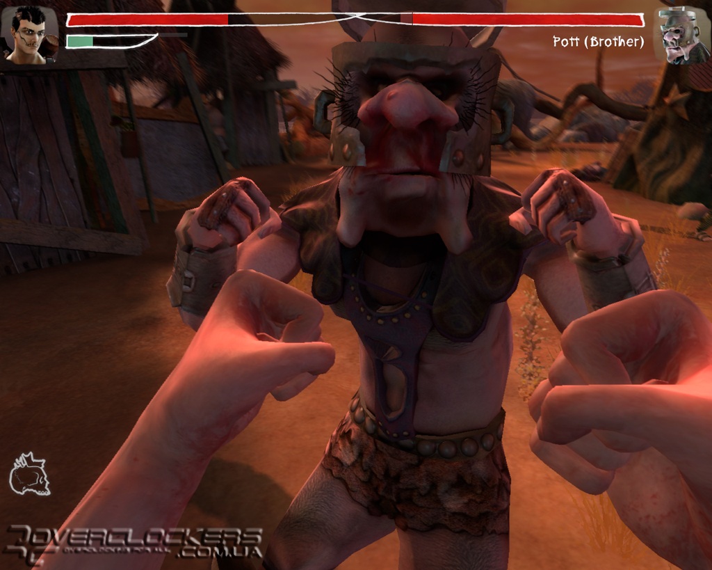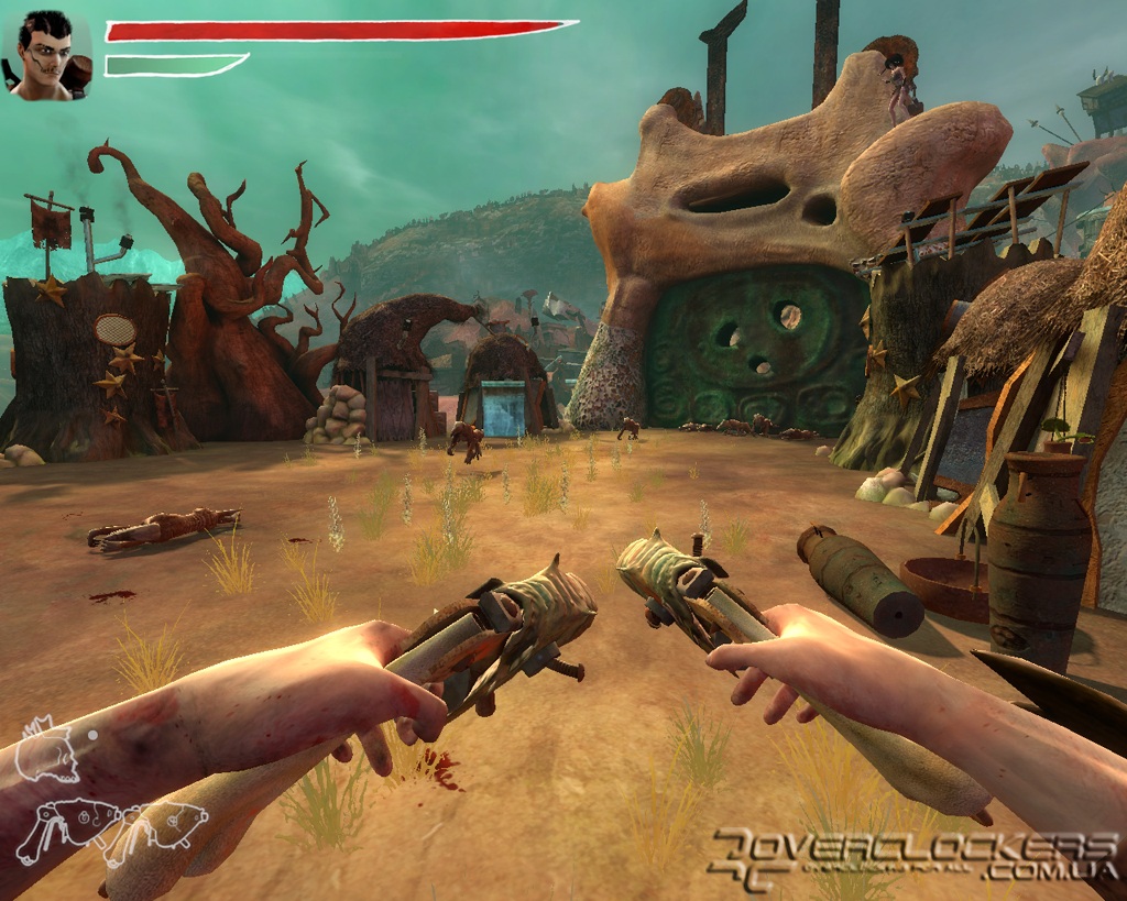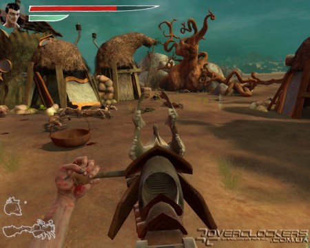 В местном арсенале есть и небольшие метательные бомбы в виде черепков и пистолет-гранатомет. Но даже наличие такого оружия в наших руках не дает больших преимуществ из-за длительной перезарядки, во время которой первый же сильный удар врага выбивает оружие из рук и нам приходится снова вспоминать навыки кулачного боя. Любители пострелять (а с таким необычным оружием — это одно удовольствие) будут немного разочарованы тем, как быстро оружие выбивают из рук героя, и что почти всю игру нам предстоит заниматься рукопашным боем. Впрочем, на больших территориях (которых очень мало), где есть возможность отбежать или укрыться за каким-то шалашом, можно довольно длительное время играть с врагами в кошки-мышки, занимаясь их обстрелом и не подпуская к себе близко.