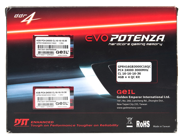 Набор GeIL GPR416GB3000C16QC относится к серии EVO Potenza и поставляется в коробочке фирменного дизайна. Имеющиеся вырезы в упаковке позволяют рассмотреть продукт еще до его покупки.