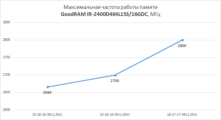 Это, пожалуй, первый комплект памяти, который не смог покорить отметку 3000 МГц. Максимум, какого режима удалось добиться от новинки GoodRAM — 2800 МГц. Выше этого значения получить так и не удалось. Ни тайминги, ни повышение напряжения, ни к чему не привели. Не помог даже восьмислойный стеклотекстолит, примененный при производстве печатных плат.