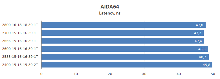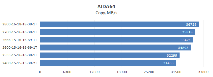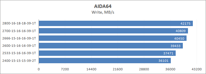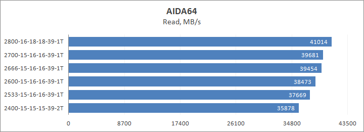 Помимо выяснения частотного потенциала в обзор памяти было решено добавить тестирование в синтетическом бенчмарке Cache & Memory benchmark утилиты AIDA64, который позволит оценить положительную или отрицательную сторону от разгона. Частота процессора и его кэша равнялась 4 ГГц.