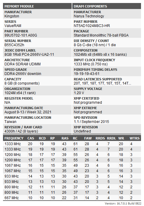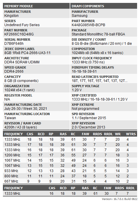 Kingston сохранил оригинальную маркировку чипов K4A8G085WB-BCTD, за ней скрываются чипы B-die для OEM-решений с тем самым частотным номиналом 2666 МГц конструктива 1Gx8.