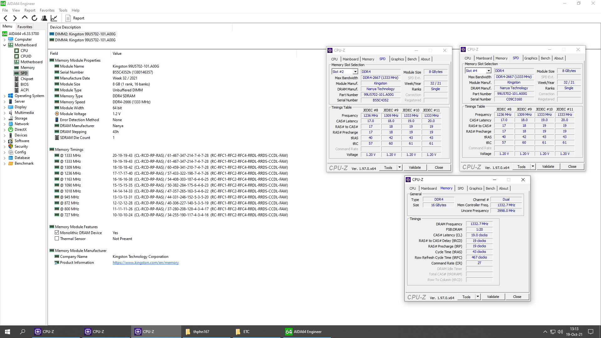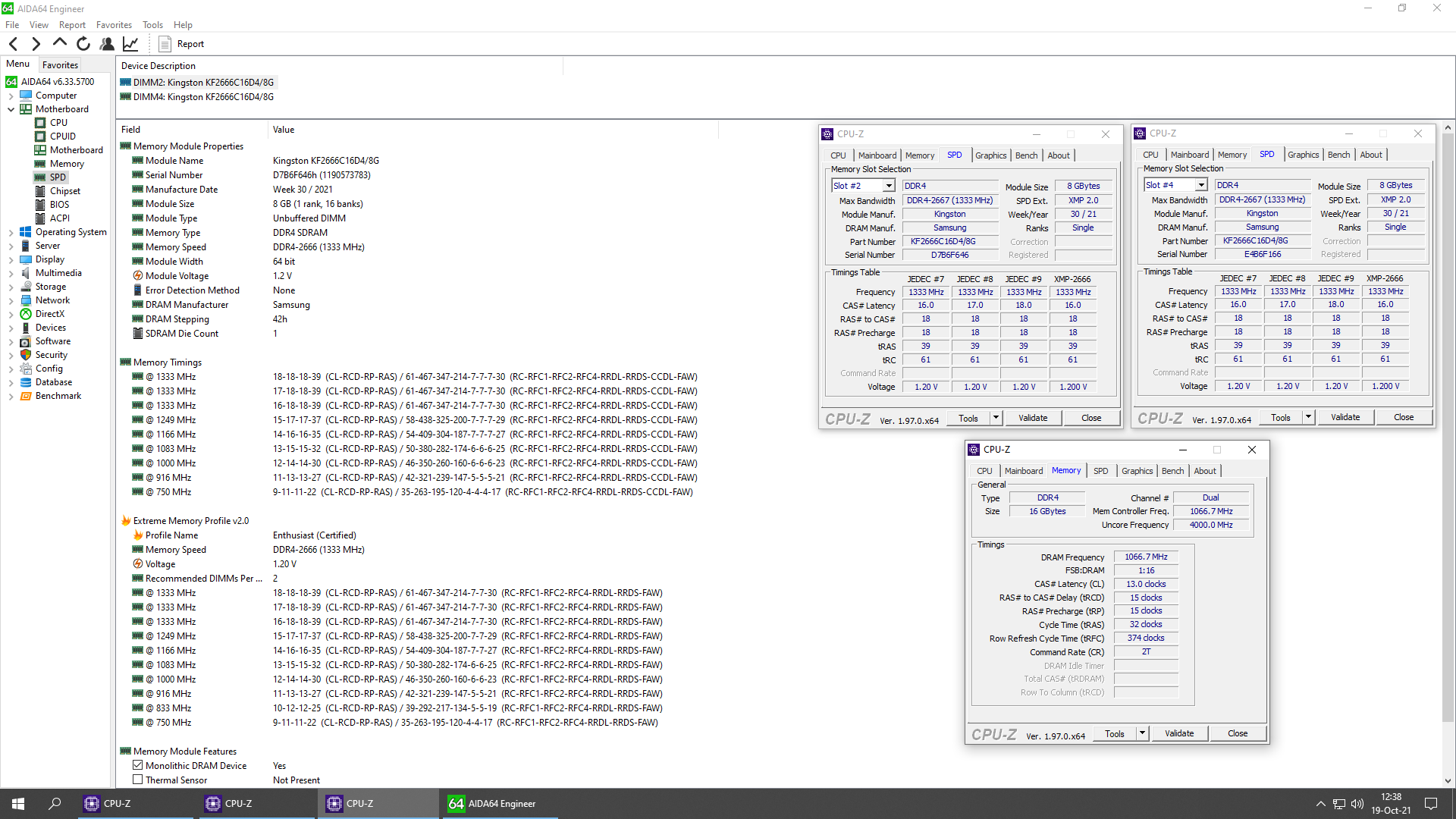 Пожалуй, еще нет таких чипов, которые могли бы составить конкуренцию Samsung B-die в плане разжеванности по тонкой настройке и статистики в Cети, так что нет смысла все расписывать. По умолчанию ОЗУ стартует на частоте 2400 МГц с таймингами JEDEC (CL17-17-17-39) и напряжением 1,2 В. XMP-профиль запускает их на частоте 2666 МГц с задержками CL16-18-18-39 и напряжением 1,2 В. Подробности AIDA64: