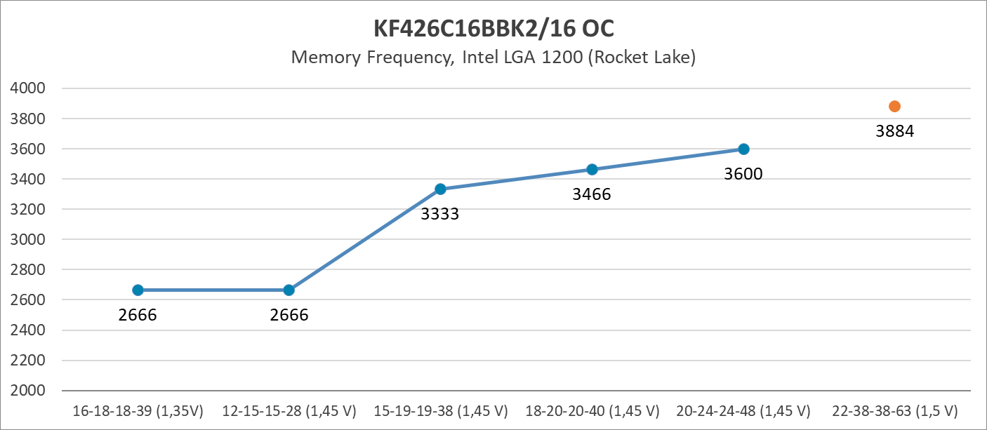 Температура в помещении равнялась 20 градусам по Цельсию. Управление оборотами вентилятора — автоматическое. Частотный потенциал оперативной памяти исследовался шагами 0,025 В напряжений, и единичными повышением частоты или таймингов на следующий шаг, стабильность системы проверялась комплексом нагрузок в виде забега LinX (problem size 32717, 8 ГБ, 10 итераций), а также прохождением Y-cruncher на пресете Pi-1b. Каждый бенчмарк запускался три раза, в результатах указано среднее арифметическое. Платформа LGA1200 работала при статичной частоте процессора 5 ГГц на всех ядрах (напряжение процессора 1,3 В), кэш (Ring) функционировал на частоте 4,5 ГГц, лимиты потребления сняты. Платформа AM4 работала при статичной частоте процессора 4,5 ГГц на всех ядрах (напряжение процессора 1,15 В), FCLK:MEM 1:1 (кроме показательного режима), лимиты потребления сняты. Во всех случаях использовался одинаковый системный накопитель с ОС Windows 10 Pro x64 21H1 (с актуальными обновлениями на момент октября 2021).
