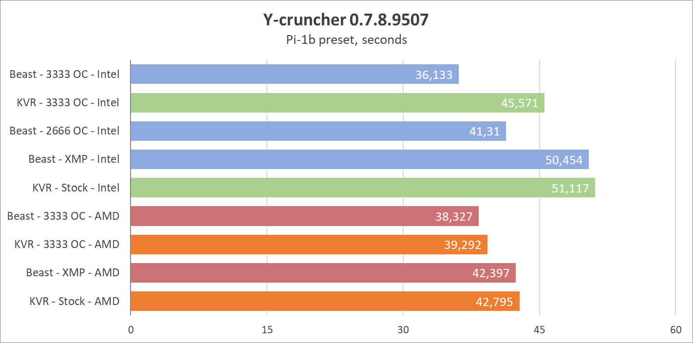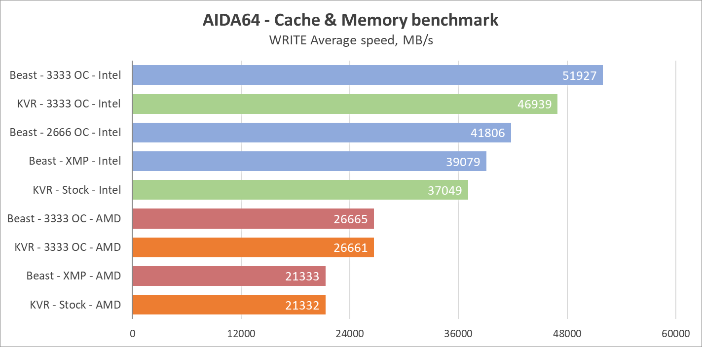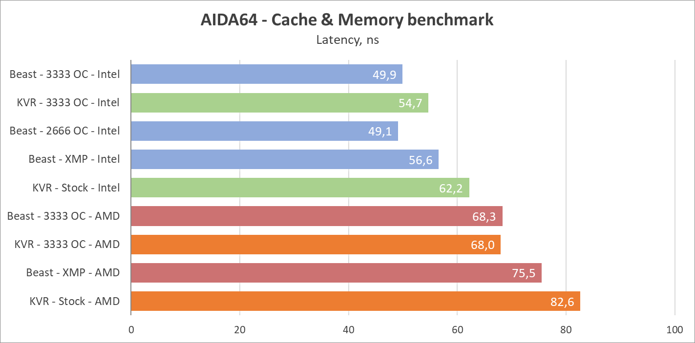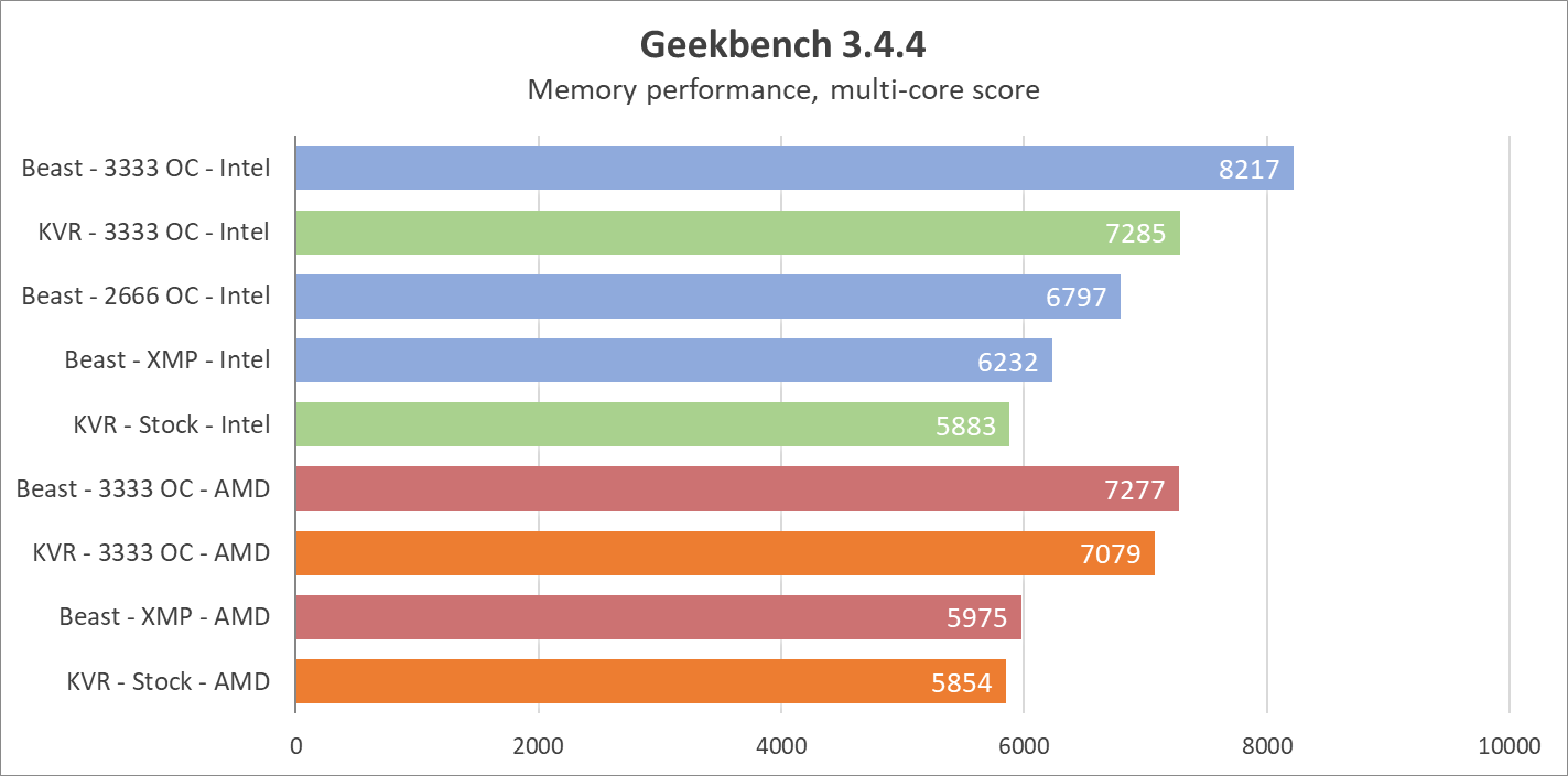 Чипы Samsung B-die — это чипы Samsung B-die, вот неожиданность-то! Даже на заявленной частоте 2666 они без проблем поддаются форсированию до 3333 МГц с оптимизированными первичными и вторичными таймингами на платформах как Intel, так и AMD. На фоне более простого комплекта Kingston ValueRAM можно рассчитывать на разрыв до ~4%, с учетом разгона обоих до единой частоты разрыв в пользу Beast составляет ~14%. А если рассматривать заводской KVR против разогнанного Beast, то разрыв впечатляет — 31%