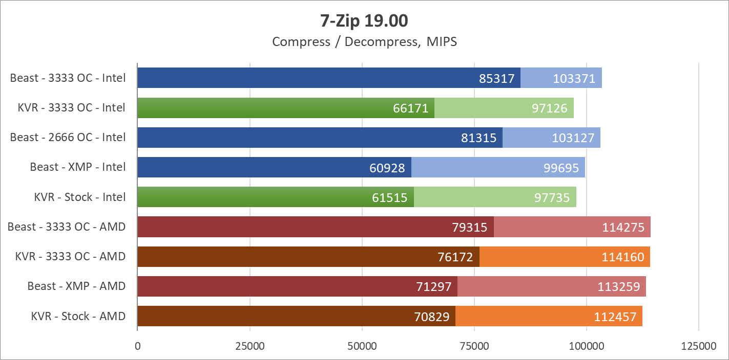 Архивирование — процесс чувствительный к оперативной памяти, особенно хорошо видна разница на платформе Intel, можно рассчитывать на рост до целых 40%.