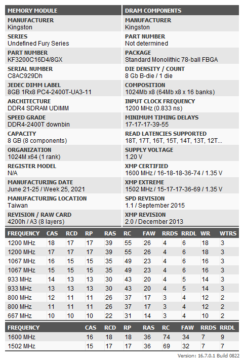 Начнем с традиционного анализа Thaiphoon Burner. Программа определяет чипы как Micron Rev. B, согласно ее же показаний, оригинальная частота чипов составляет 2400 МГц, и опережая события, их поведение во время экспериментов это подтверждает.