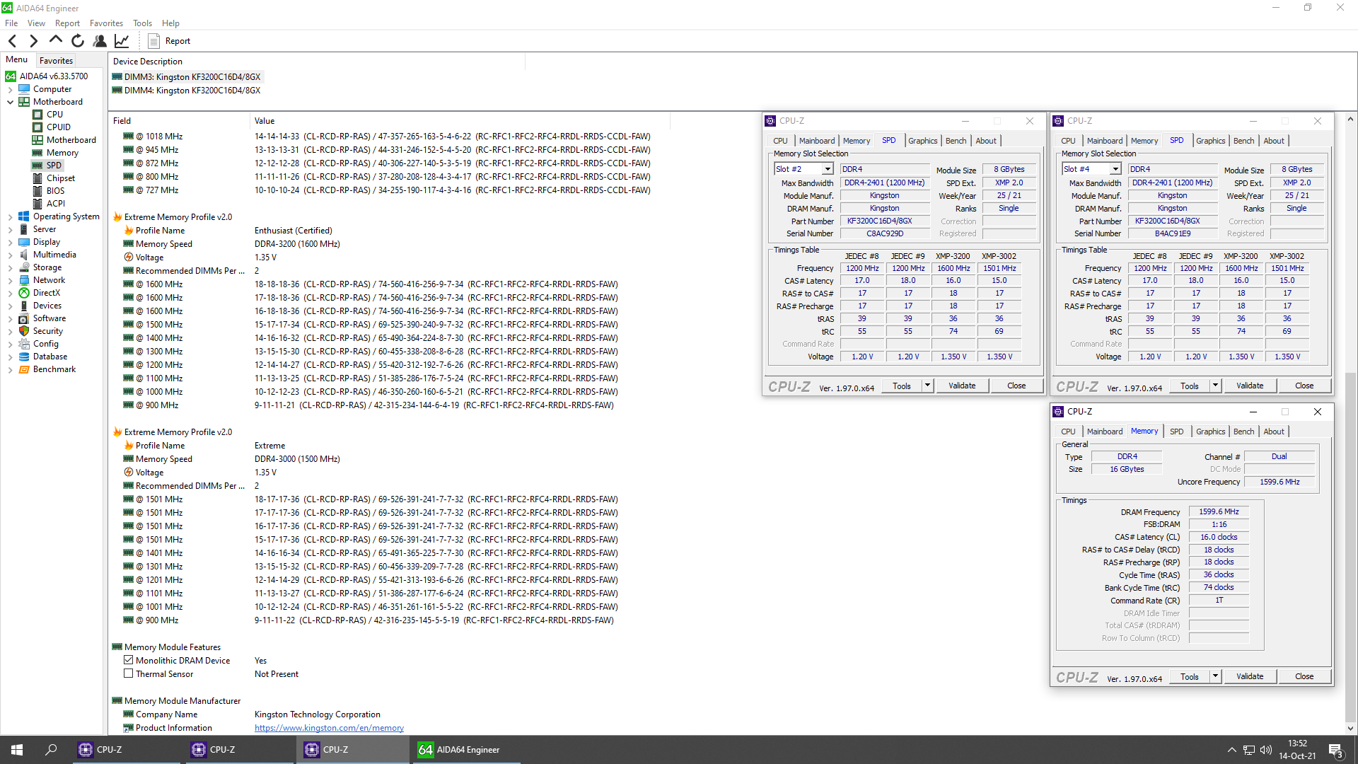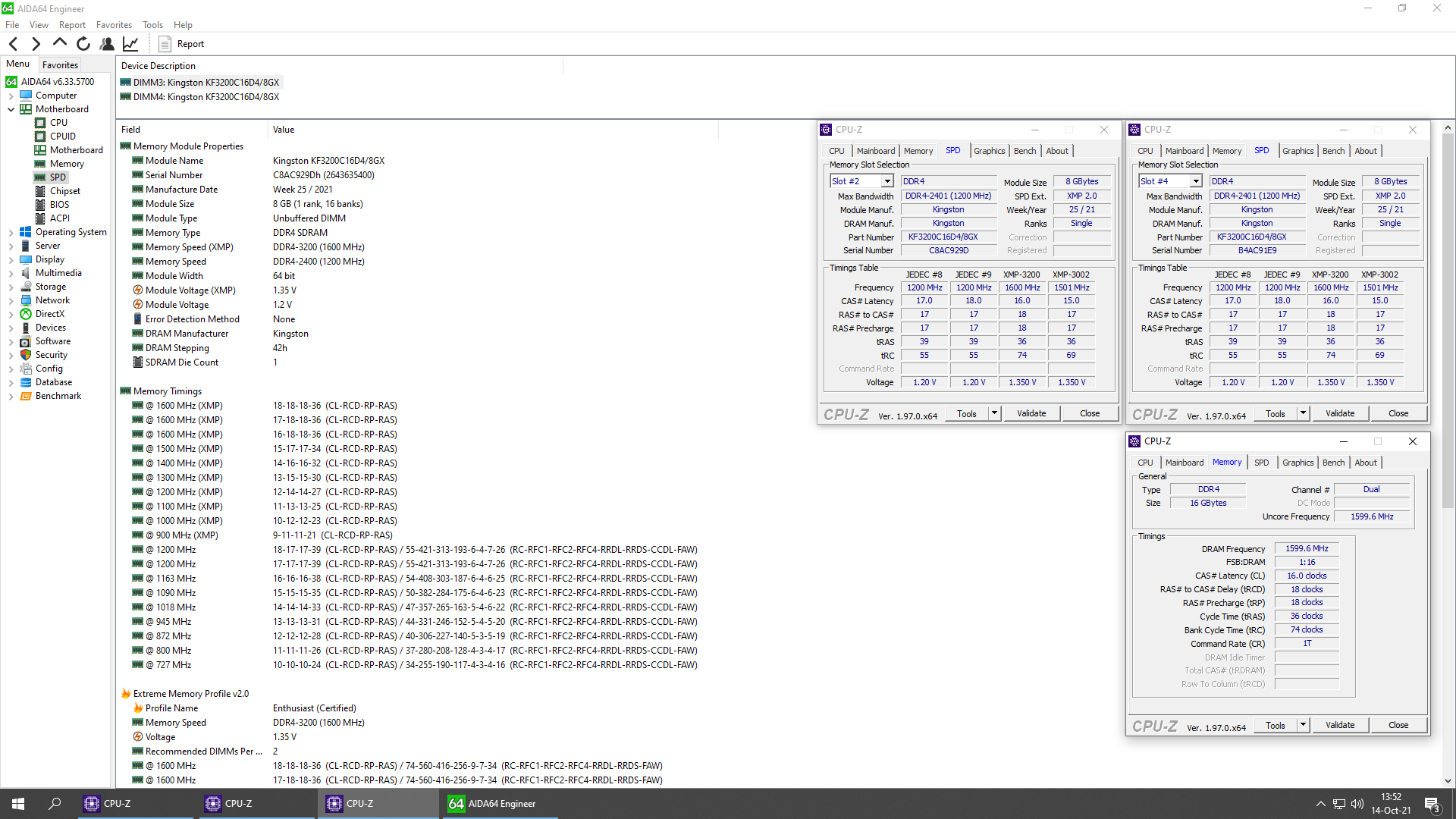 По умолчанию ОЗУ будет функционировать на частоте 2400 МГц с таймингами JEDEC (CL17-17-17-39) и напряжением 1,2 В. XMP-профиль запустит планки на частоте 3200 МГц с задержками CL16-18-18-36 и напряжением 1,35 В. Теперь телеметрия AIDA64: