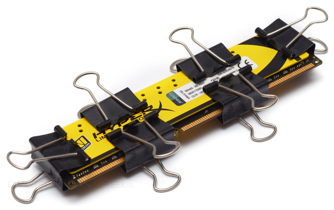Несмотря на то что разобрать планку памяти было довольно проблематично, собрать её в исходное состояние не вызвано никаких затруднений. Липкая с двух сторон термопрокладка, которая удерживает пластину радиатора на чипах, оказалась очень качественной. И даже после прогрева и разборки она остаётся мягкой и клейкой. Поэтому для сборки нужно всего лишь расположить «термолипучку» на своём месте, затем хорошо прижать половинки радиатора. Для надёжности можно на несколько минут зажать собранный модуль прищепками. После сборки память не отличить от новой.