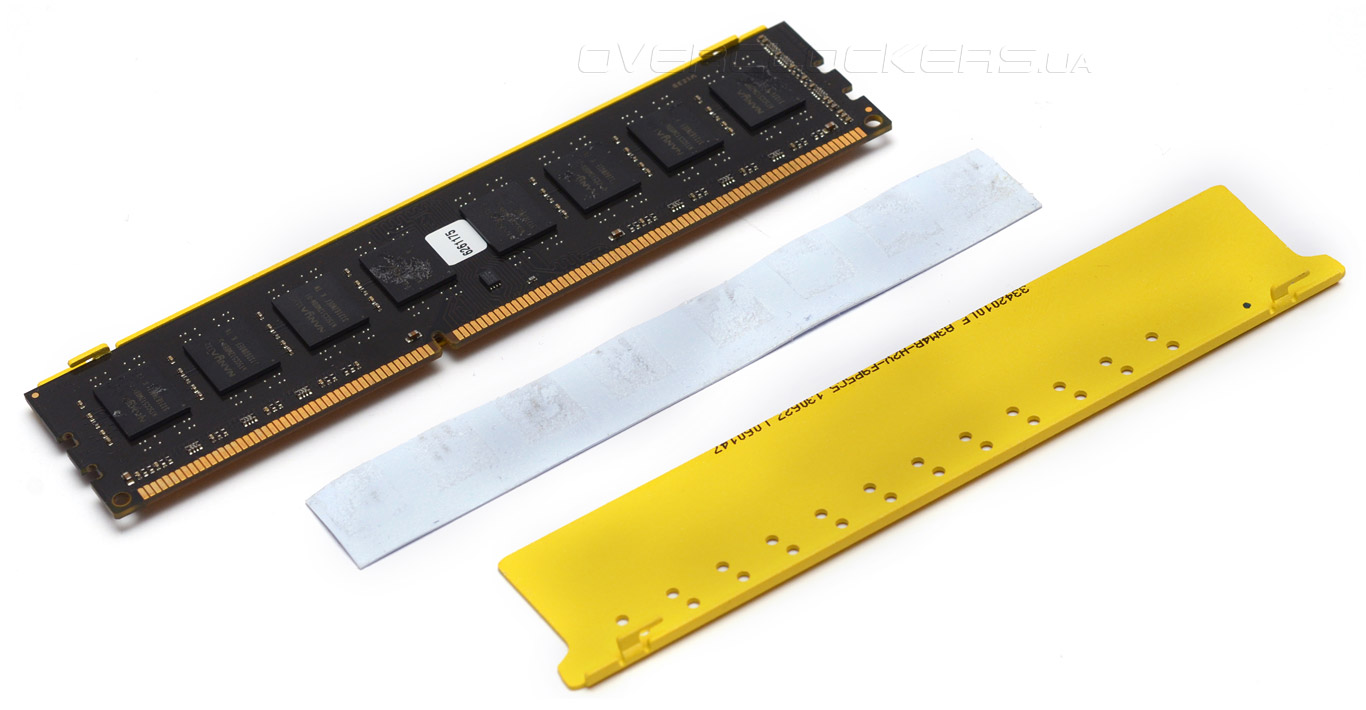 Традиционно для наших обзоров, мы решили заглянуть под радиаторы, чтобы получить информацию об установленных чипах памяти. Сделать это оказалось не так просто. Радиаторы сильно приклеены к чипам, поэтому снимать их нужно с предельной аккуратностью, хорошо прогревая феном. После десяти двадцатиминутных потуг разобрать модуль всё же удалось.