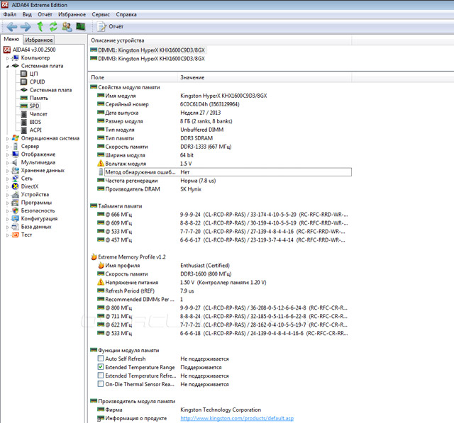 Модули памяти рассчитаны на номинальную частоту 1600 МГц с задержками CL9-9-9-27. Рекомендуемое значение Command Rate не указано. Штатное напряжение питания составляет 1,5 В. Соответствующие значения прописано в SPD в виде профиля XPM. Кроме того в прошивки присутствуют и стандартные наборы задержек по JEDEC. Никаких профилей с напряжением выше, чем полтора вольта в SPD не прописано, то есть набор памяти позиционируется как низковольтный, а не оверклокерский.