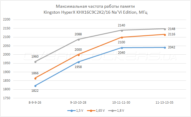 Частотные показатели памяти Kingston HyperX KHX16C9C2K2/16 Na’Vi Edition оказались ниже ожидаемых нами. Чипы Nanya явно не подходят для значительного разгона. Так даже протестированный ранее комплект бюджетной низковольтной памяти Hynix обошёл по частоте новинку. Кроме того стоит отметить специфический характер разгона чипов NT5CC512M8BN-DI. Микросхемы неплохо ведут себя при низком напряжении, показывая частоты заметно выше номинальных. При этом повышение напряжения даже до 1,8 В не позволяет получить частот свыше 2200 МГц. Ослабление задержек до CL11-13-13-35-1T вообще не даёт практически никакого прироста относительно режима CL10-11-11-30-1T. То есть на высокую тактовую частоту память не рассчитана. Наиболее оптимальным режимом можно считать 2100 МГц при CL10-11-11-30-1T. Для большей убедительности полученных результатов тест также был проведён на платформе LGA1155 с отборным Intel Core i7-3770K.