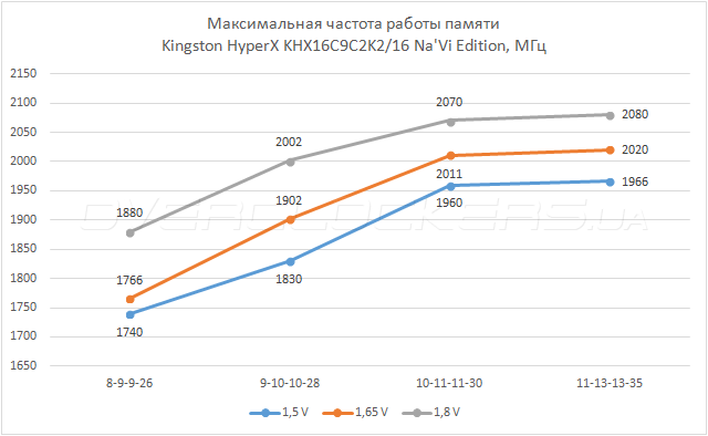 Нужно сказать и пару слов о температурном режиме модулей. Для замера температуры радиаторов и чипов оперативной памяти мы используем инфракрасный термометр с погрешностью измерения около одного градуса Цельсия. Температурные показатели модулей находятся в среднем на 8–9 градусов выше, чем у планок с чипами Hynix последних поколений в аналогичных режимах функционирования. Однако дополнительное охлаждение модулей Kingston Na’Vi Edition не принесло желаемого увеличения разгонного потенциала. То есть температурный режим не является ограничивающим фактором. А в режимах, которые отображены на графиках, память может стабильно работать вне зависимости от наличия или отсутствия дополнительного охлаждения.