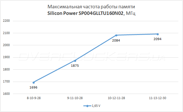 Ну что же, память с неба звезд не хватает, но для разгона она изначально и не предназначалась. Показатели на 300–500 МГц хуже, чем у популярных чипов Hynix. Скорее всего, для нашего Silicon Power повышение частот — это приятный бонус и не более того. При снижении напряжения до 1,5 В результаты станут чуть хуже, но в любом случае, для номинальной частоты или даже 1866 МГц вполне можно будет выставить более агрессивные тайминги, чем 11-11-11-28.