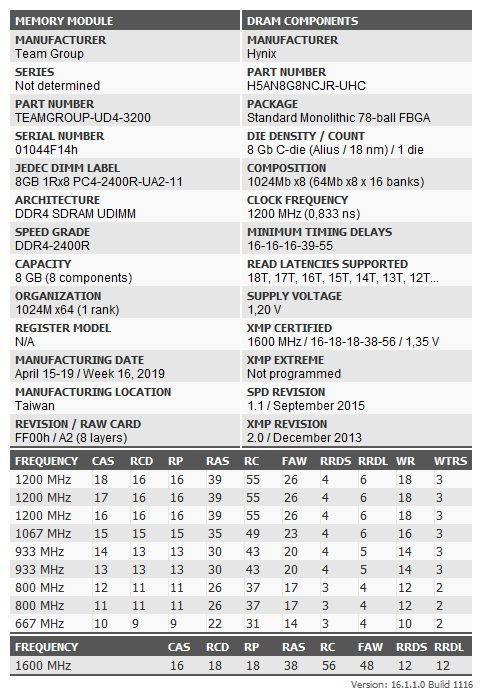 На каждой планке установлено по восемь микросхем с фирменной маркировкой Team T4D10248HT-32, но как покажет утилита Thaiphoon Burner, здесь используются чипы SK hynix H5AN8G8NCJR-UHC, во что охотно верится, учитывая поведение Vulcan Z при разгоне.