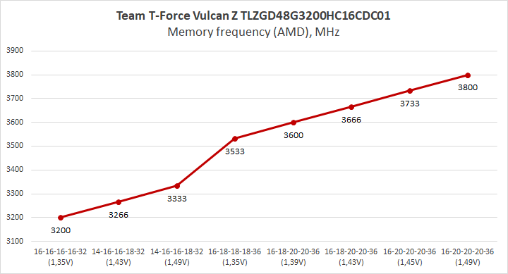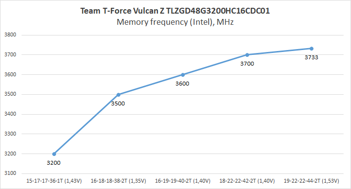 Сперва посмотрим на возможности памяти без повышения частоты. На 3200 МГц удалось снизить тайминги лишь на один пункт, для чего потребовалось повысить питающее напряжение до 1,43 В. Зато Command Rate удалось снизить до 1. На следующем этапе, когда используются заводские задержки, мы достигли 3500 МГц с напряжением по умолчанию, а вот дальнейший рост частоты потребовал, как отпустить тайминги, так и поднять напряжение, причем максимальный результат в 3733 МГц нам покорился с 19-22-22-44-2Т и 1,53 В!