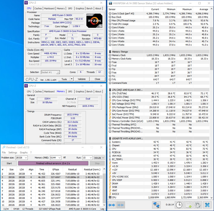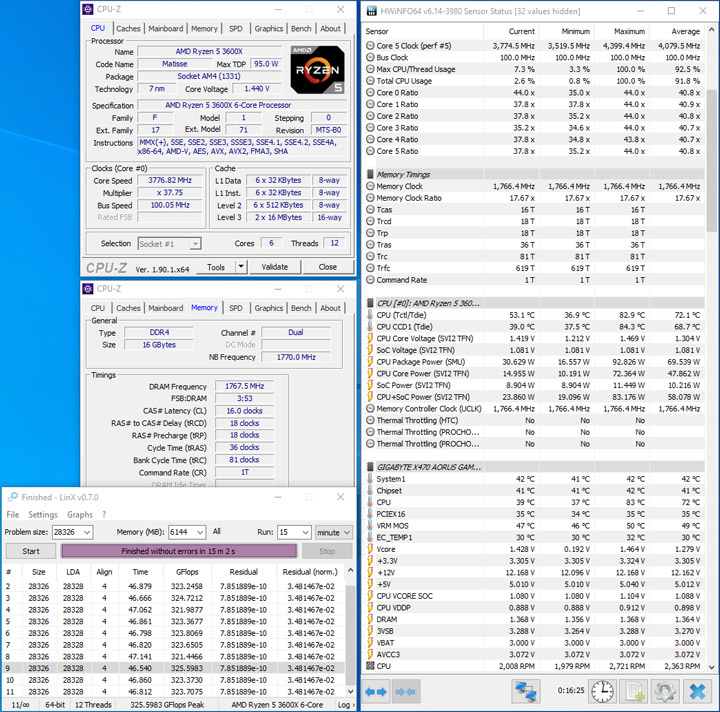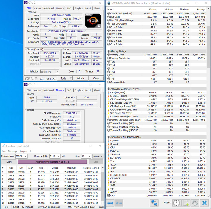 Тестирование проводилось в среде Windows 10 x64. Для проверки на стабильность разгона модулей использовалась программа LinX 0.7.0 AMD Edition в течение 15 минут, объем памяти в которой устанавливался на отметке 6144 МБ. Вычислительные ядра процессора работали на частоте по умолчанию, напряжение на SoC выставлялось на уровне 1,1 В. На всех частотах память работала с Command Rate, равным 1.