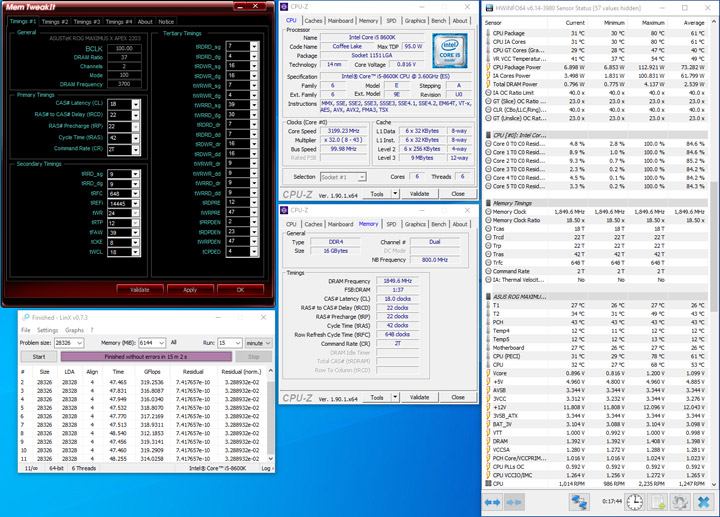 Тестирование проводилось в среде Windows 10 x64. Для проверки на стабильность разгона модулей использовалась программа LinX 0.7.3 в течение 15 минут, объем памяти в которой устанавливался на отметке 6144 МБ. Вычислительные ядра процессора работали на частоте 4000 МГц, кэш — 4000 МГц. Напряжения SA и IO выставлялись на уровне 1,25 и 1,225 В соответственно.