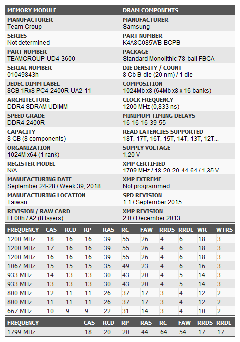 В SPD модулей прошиты стандартные частоты JEDEC и один профиль XMP. При старте системы по умолчанию, память запустится на частоте 2400 МГц с задержками вида 16-16-16-39-2Т и напряжением питания 1,2 В. Чтобы ее вывести на номинальный режим работы придется вручную активировать профиль XMP в UEFI материнской платы. Тогда она уже будет функционировать на частоте 3600 МГц с таймингами 18-20-20-44-2Т и напряжением 1,35 В.