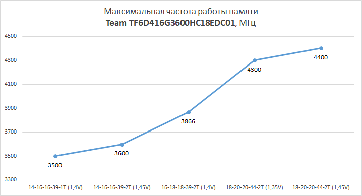 Command Rate 1T покорился лишь на частоте 3500 МГц с напряжением 1,4 В, причем, тайминги можно было оставить минимальные. Предел частоты при формуле задержек вида 16-18-18-39-2Т и 1,4 В составил 3866 МГц, тогда как с родным напряжением можно было ограничиться лишь 3733 МГц.