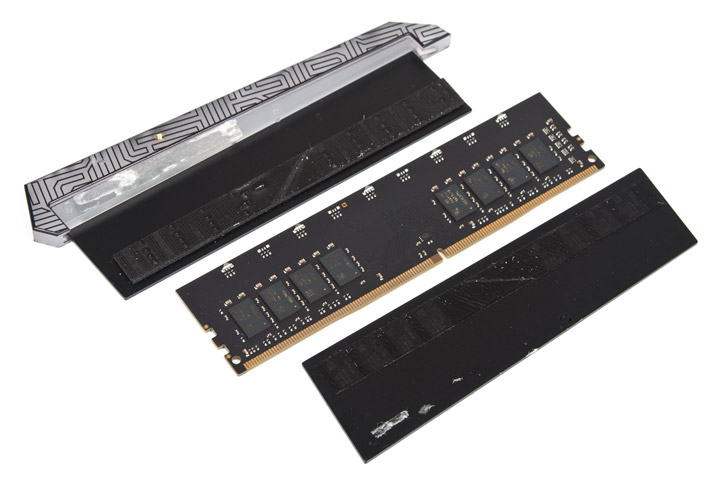 Вся конструкция держится за счет «двухстороннего скотча», нанесенного в районе микросхем памяти и с одной стороны световода. На плате расположено лишь восемь микросхем памяти и с обратной стороны вместо них на половинку радиатора приклеена прокладка из пористого материала, что повышает общую жесткость модуля. С каждой стороны PCB, у верхнего края, расположено по пять RGB-светодиодов.