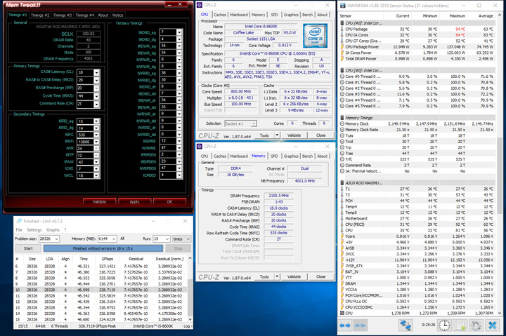 Тестирование проводилось в среде Windows 10 x64. Для проверки на стабильность разгона модулей использовалась программа LinX 0.7.3 в течение 15 проходов, объем памяти в которой устанавливался на отметке 6144 МБ.