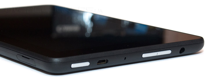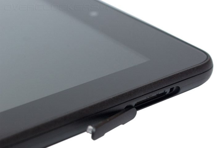 На правой грани находится слот для карт памяти стандарта microSDXC, максимальный объем которых может достигать 128 гигабайт. И это хорошая новость, ведь сам Fire оборудован всего восемью гигабайтами встроенной памяти, из которых пользователю доступно чуть более пяти с половиной гигабайт.