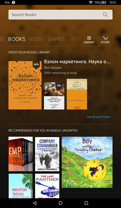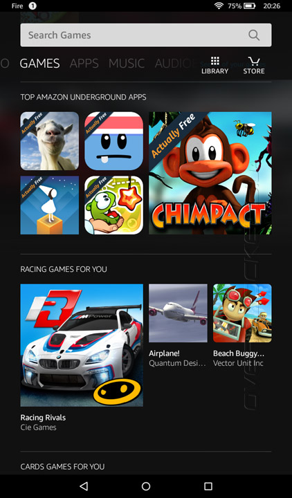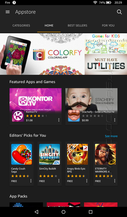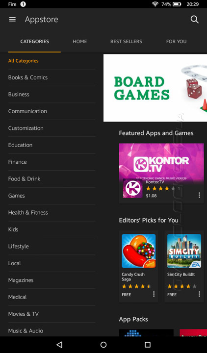 Кастомизация затронула и такой немаловажный момент, как магазин программного обеспечения. В Fire его роль выполняет Amazon Appstore. Предлагаемый ассортимент приложений заметно уступает более продвинутому Google Play, что, к слову, доставляет немало неудобств. Довольно часто приходится искать альтернативу тому или ПО.
