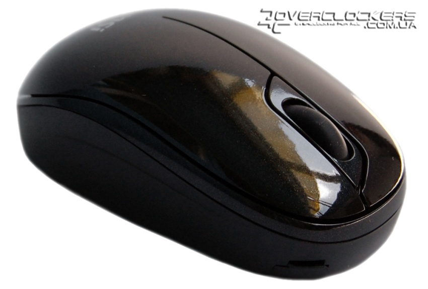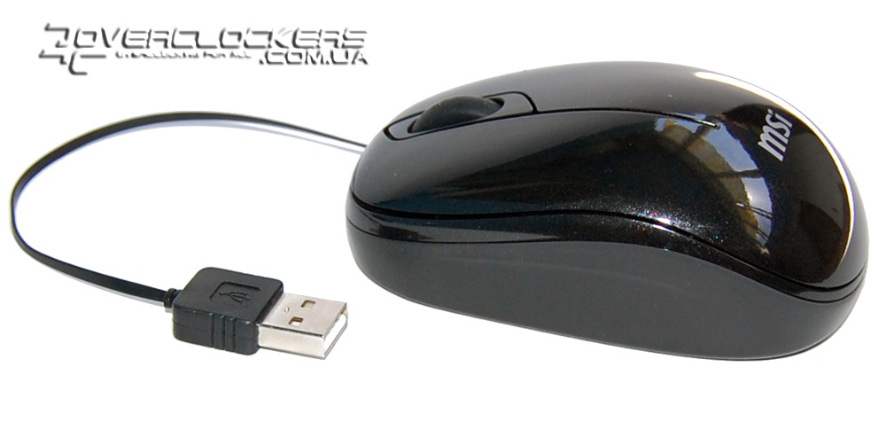 Компактная мышка имеет короткий сматывающийся провод, который прячется внутри ее корпуса. Выполнена она из черного блестящего пластика, что немного не сочетается со светло-серым цветом самого ноутбука.