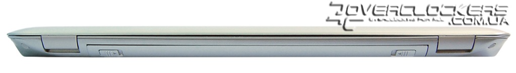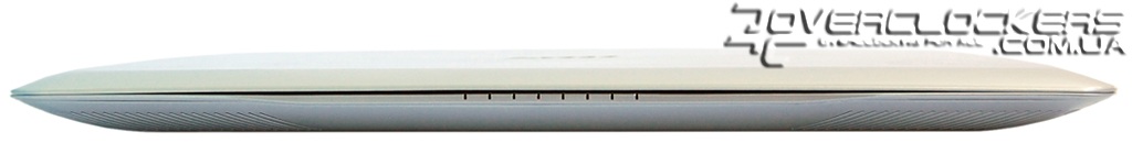 Нижняя часть ноутбука имеет четыре тонкие резиновые вставки для того, чтобы он не ерзал по поверхности стола. Небольшие отверстия по бокам служат не только для вентиляции — за ними располагаются и встроенные динамики.