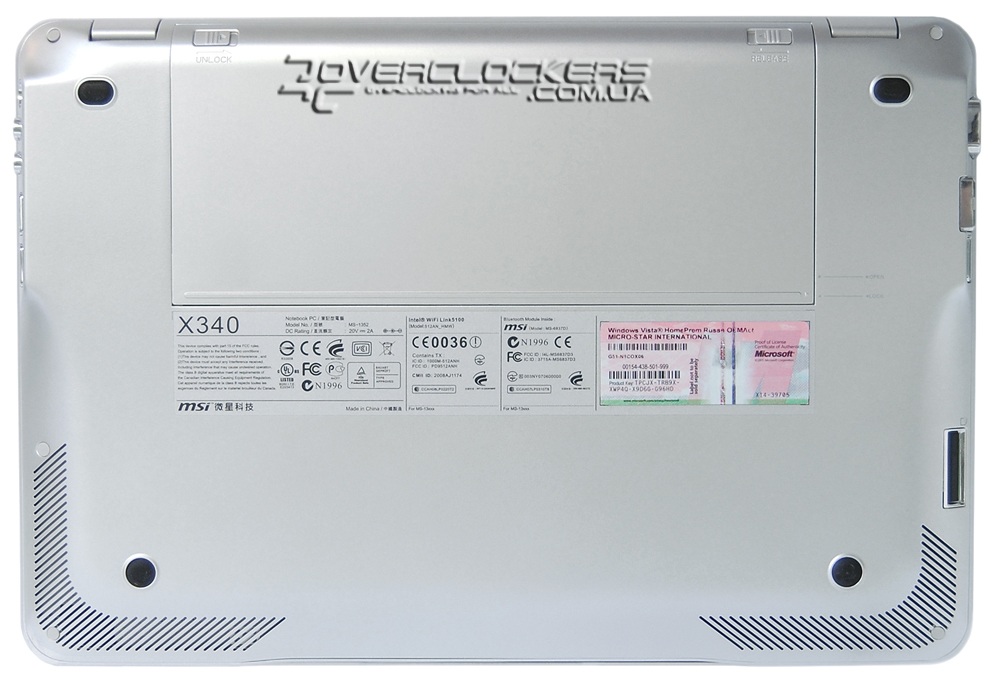 Как вы видите, конструкция корпуса не имеет никаких съемных частей и крышек, и заменить или добавить один из компонентов (память или жесткий диск) в MSI X340 нельзя. Единственный съемный компонент — это четырехэлементная батарея на 2150 мА/ч.