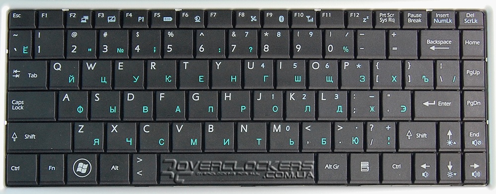Клавиатура компактной раскладки без цифровой части, буквы кириллицы светло-голубого цвета, никаких дополнительных мультимедийных клавиш не предусмотрено. В ходе использования ноутбука оказалось, что клавиатура слегка выгибается, как будто она выполнена в виде единой резиновой прокладки, которая прогибается от нажатий на клавиши. Для того, кто много набирает на традиционной настольной клавиатуре, ощущение не совсем приятное.