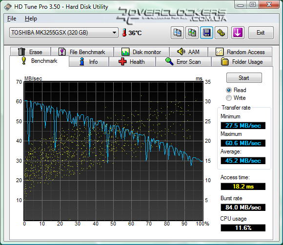 На фоне настольных жестких дисков Toshiba MK3255GSX конечно не блещет высокой скоростью чтения, но для мобильного накопителя результат вполне пристойный.
