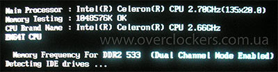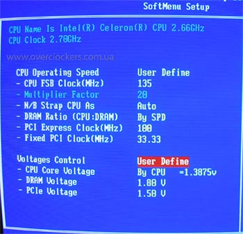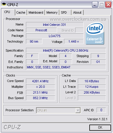 При этом Celeron D 331 2,66 ГГц превратился в Celeron D3xx с частотой 4,26 ГГц. А помогли ему в этом, кроме завышенной частоты FSB, поднятое напряжение ядра на 0,1 В и повышенные тайминги памяти, с увеличенным напряжением питания до 2 В, так как она сама была в состоянии "оверклокерской эйфории".