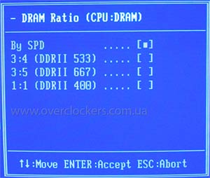 Доступны такие делители: 1:1, 4:5, 3:4, 3:5, 1:2, 2:3, либо By SPD. Все просто, разгоняем, допустим, тот же Celeron с частоты FSB 133 (533) МГц до 200 (800) МГц, выбираем PSB800 и соответствующий делитель памяти. Т.е. результирующая частота (реальная, не DDR) памяти равна делению частоты FSB на первое значение делителя и последующее умножение на второе значение того же делителя.