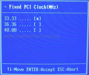 Параметр Fixed PCI Clock(MHz) позволяет зафиксировать частоту шины PCI на нужном значении: 33,33 МГц, 36,36 МГц или 40,00 МГц.