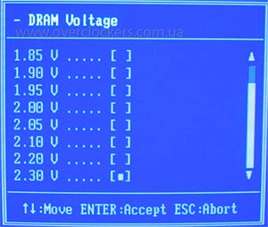 на памяти - от 1,75 до 2,3 В, где шаг до 2,1 В составляет 0,05 В, а от 2,1 до 2,3 уже 0,1 В.