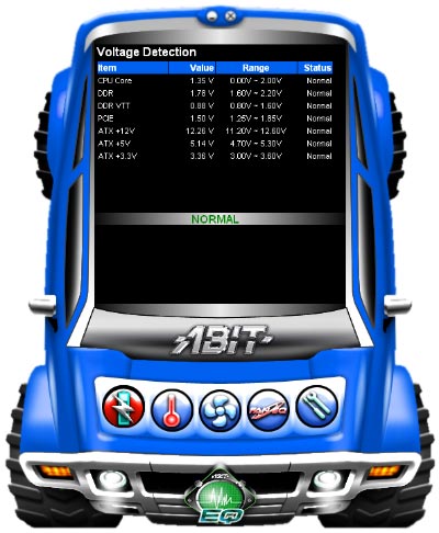 Кроме драйверов, на диске имеется программа Flash Menu позволяющая перепрошить BIOS в среде Windows, и утилита мониторинга Abit EQ с очень забавным дизайном в виде машины похожей на спортивный Hammer.