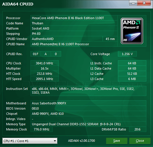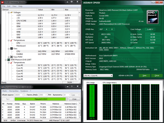 В то же время, максимальный разгон нашего тестового AMD Phenom II X6 1100T не составил никакого труда. После установки коэффициента умножения на вычислительных ядрах 20x и повышения напряжения Vcore до 1,4625 В, мы добились устойчивой работы системы на частоте 4000 МГц. При этом модули оперативной памяти работали в режиме 1600 МГц с задержками 9-9-9-24-1Т, а частота встроенного северного моста составила 2600 МГц.