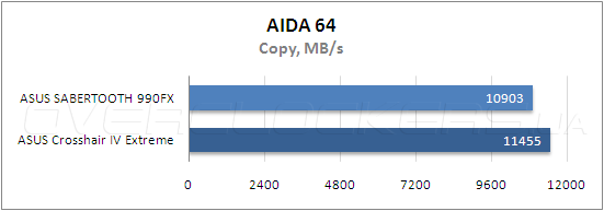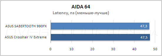 В приложении Cache & Memory benchmark информационно-диагностической утилиты AIDA64 2.00.1700 системная плата ASUS Sabertooth 990FX продемонстрировала хорошие результаты в тестах чтения и записи, но отстала от ASUS Crosshair IV Extreme при копировании данных в ОЗУ. Такие показатели означают, что в реальных приложениях разница будет малозаметна.